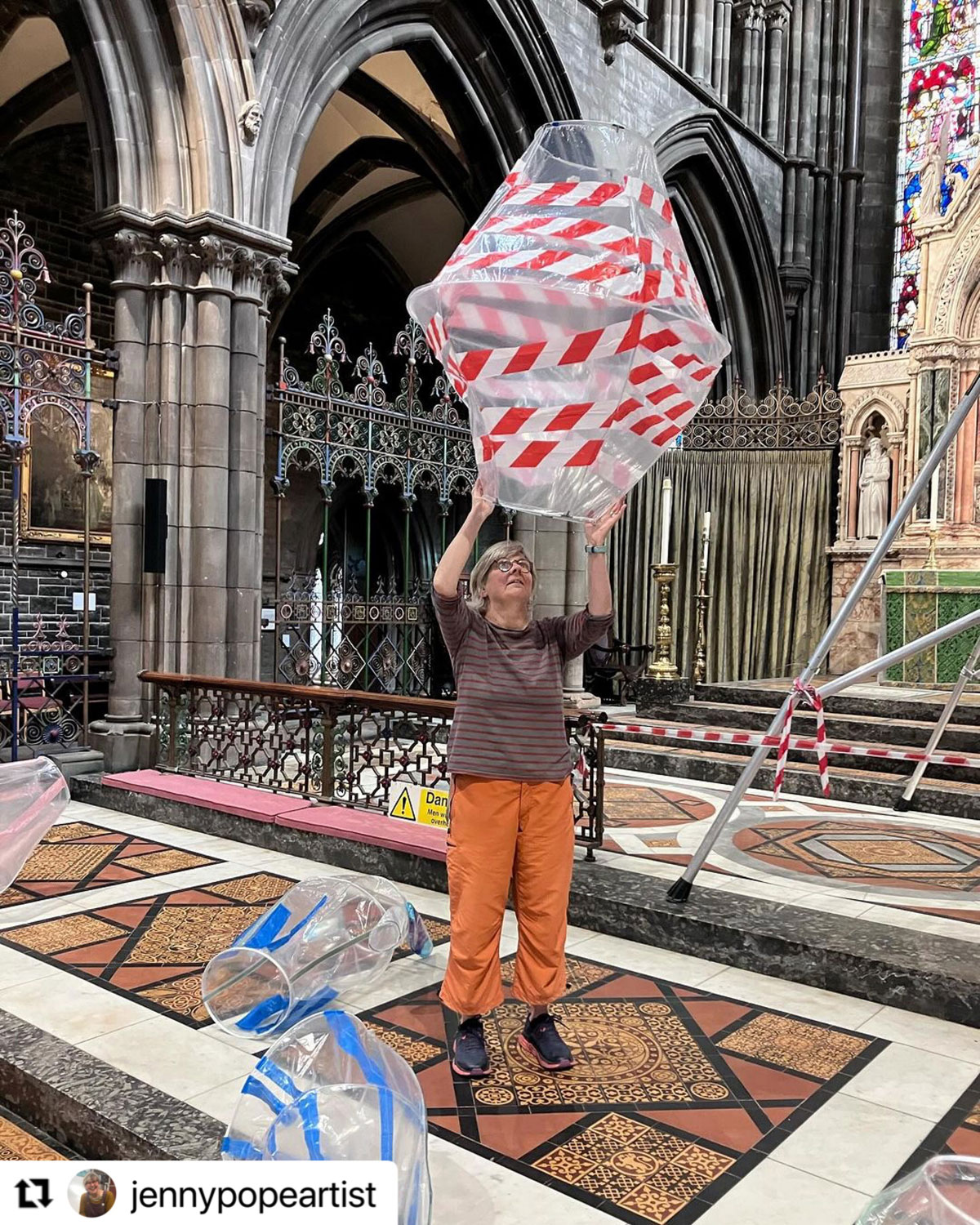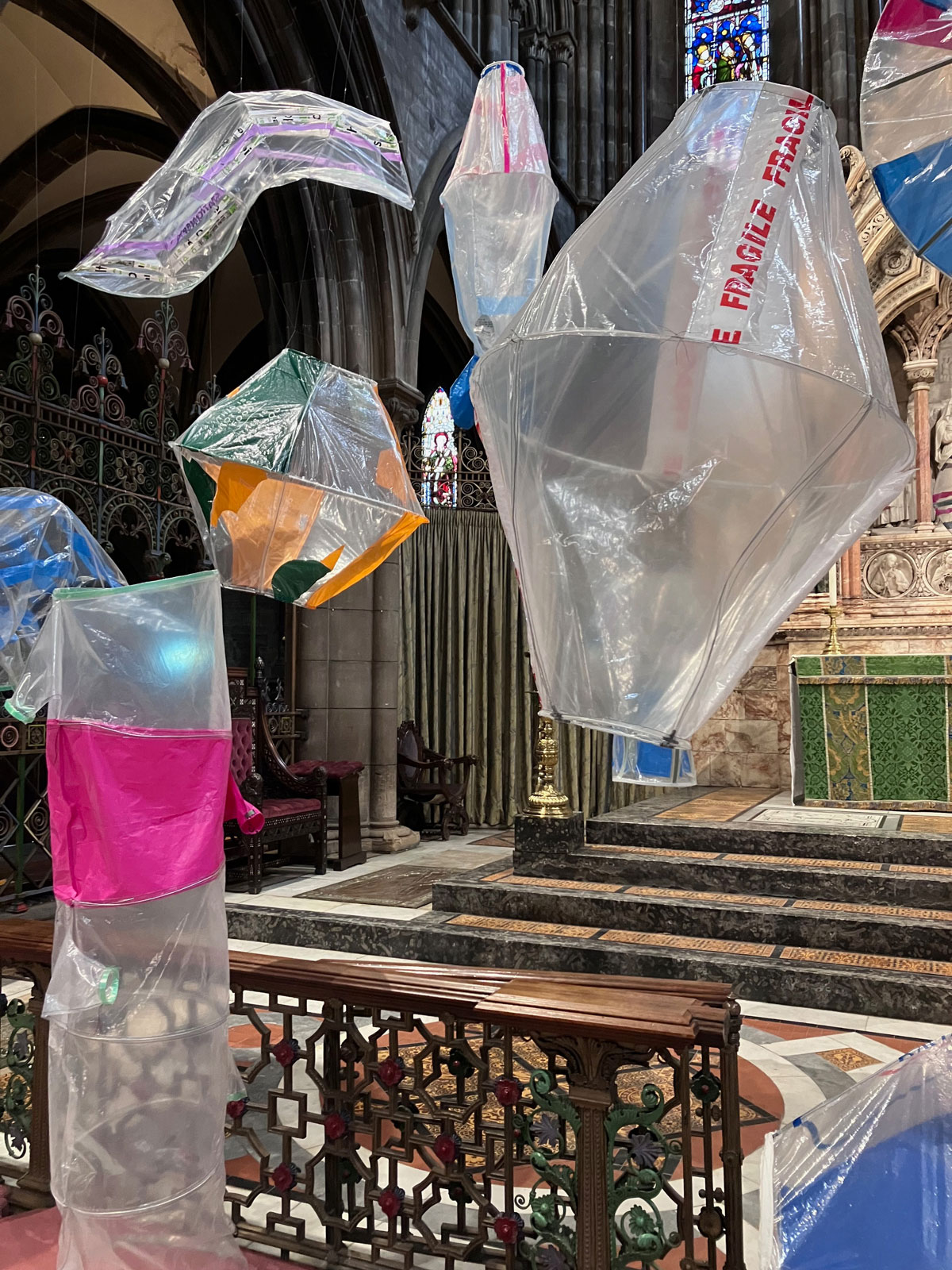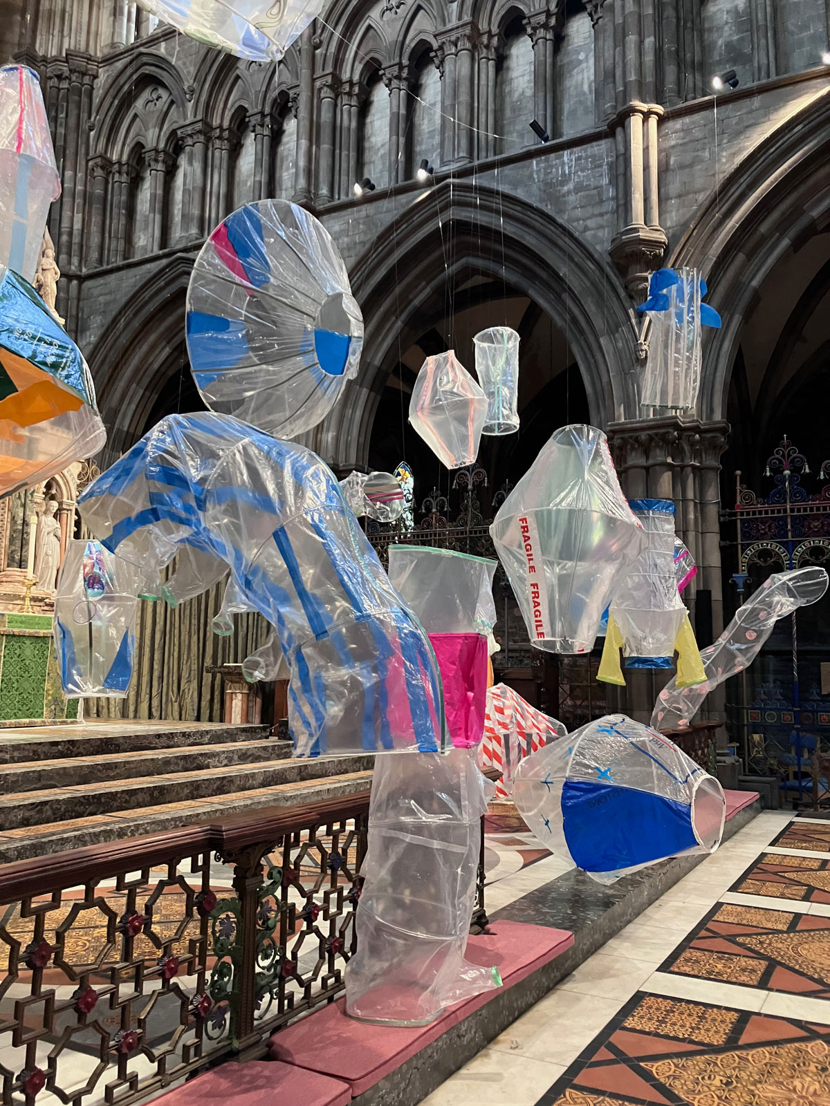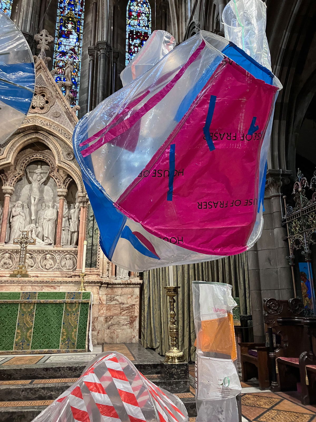 In 2024 I transposed the concept of floating and buoyancy to a completely different location, one within the magnificent St Mary’s Episcopal Cathedral in Edinburgh. I was approached by Jonathan Baxter, embedded artist at the cathedral and A+E project to make an installation for the Summer programme 2024 , I created a floating plastic fossil installation above the high altar.