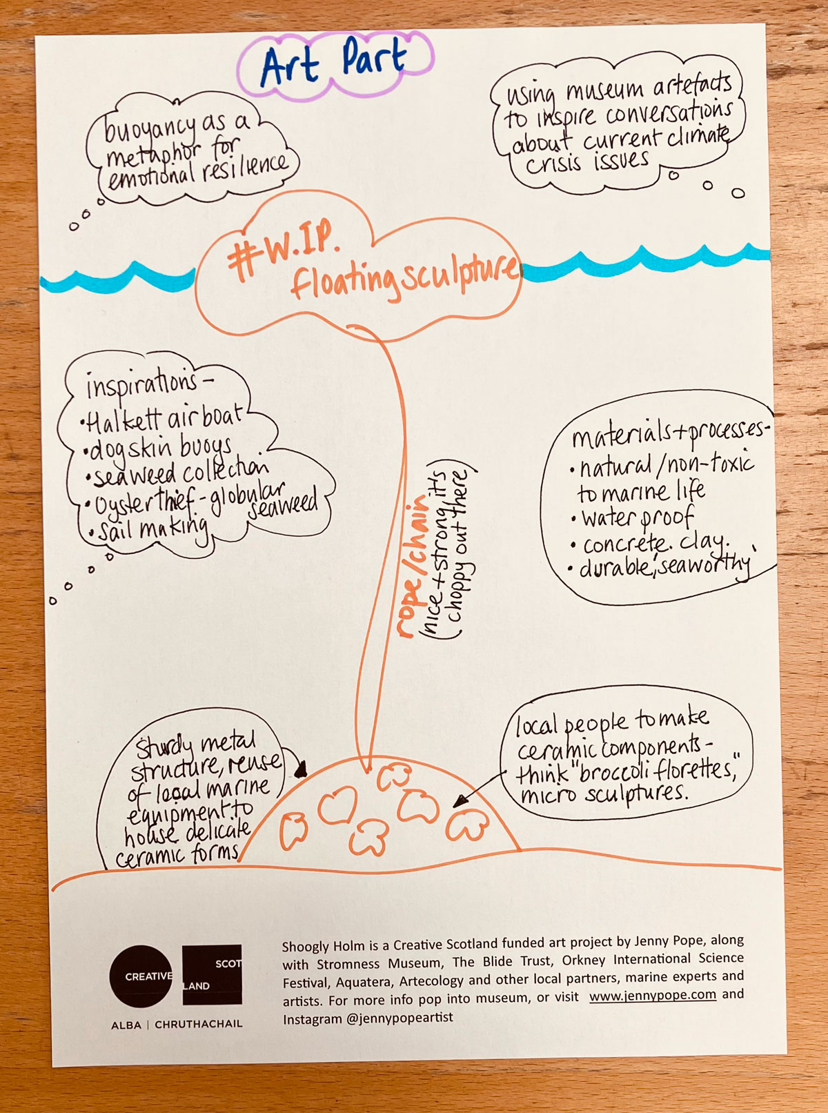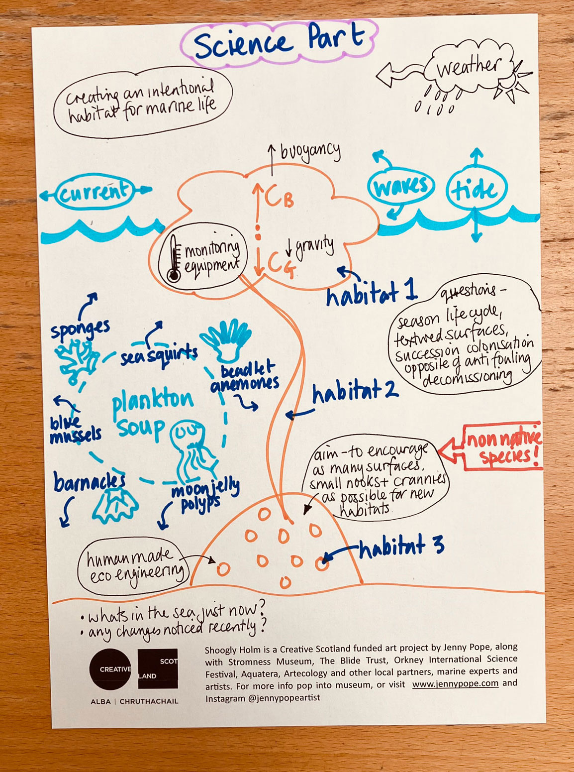 I presented my inspiration, research ideas and progress for the project Shoogly Holm. I described how visual art can become an intentional habitat for marine life and a starting point for citizen science. I was joined by Jenni Kakkonen, from Orkney Harbours Marine Environmental Unit to explain local marine colonisation and settlement. Then an informal discussion was led by Gareth Davies, CEO at Aquatera.