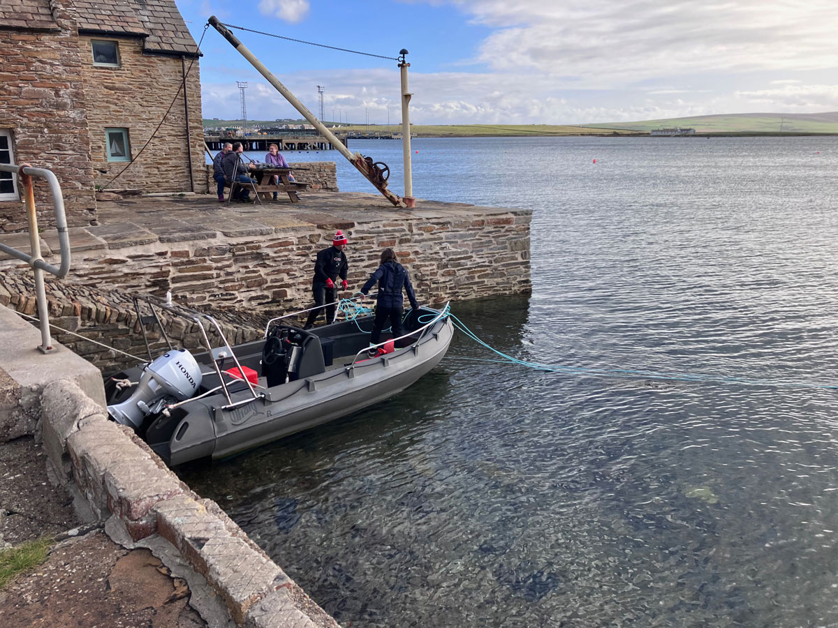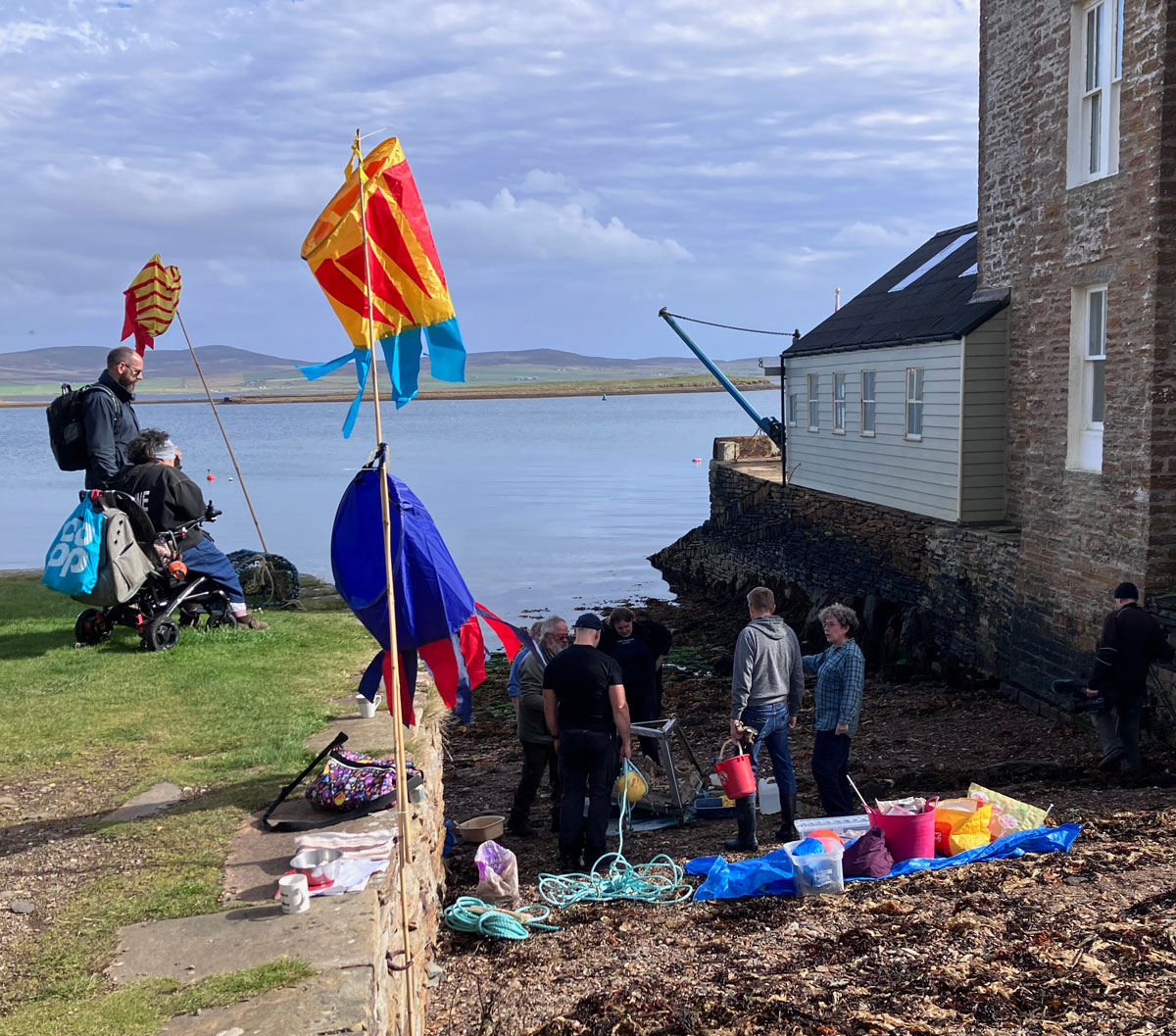 Next day there was a ceremonial send off, the mooring was towed from the beach to a position just off shore of the museum by James Burgon of the UHI Nav School and Malcolm Thomson of Sula Diving. They were assisted by Baptiste Mathie-Claverie from EMEC. There were poetry readings by Ali Skene and Anne Bevan and a few words to toast the mooring by Gareth Davies, Jenny Pope and Katy Firth, all accompanied by whisky and cake.