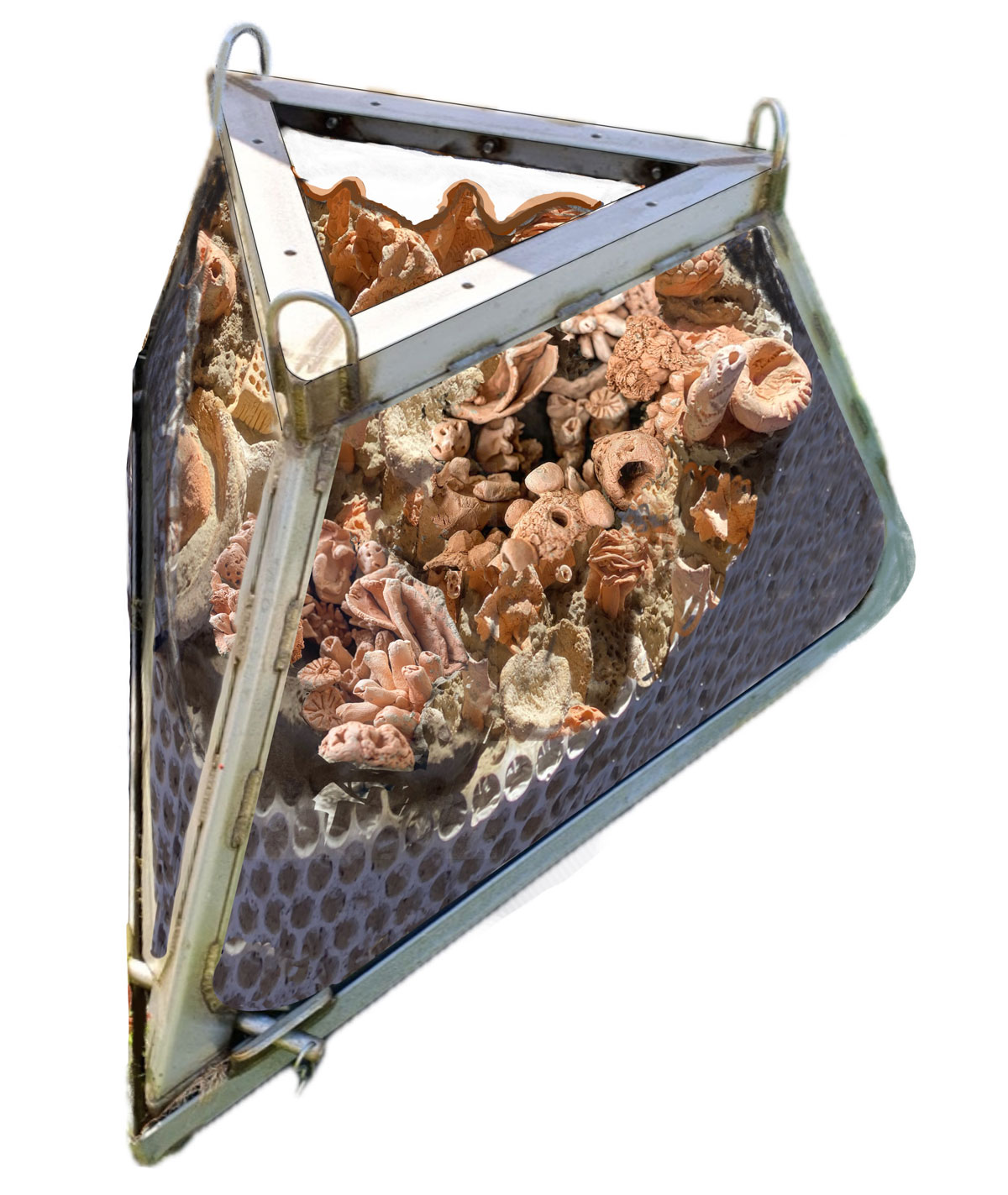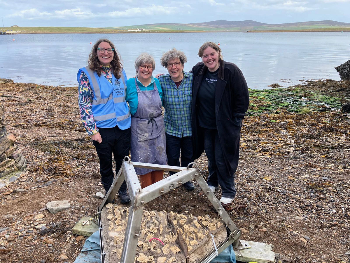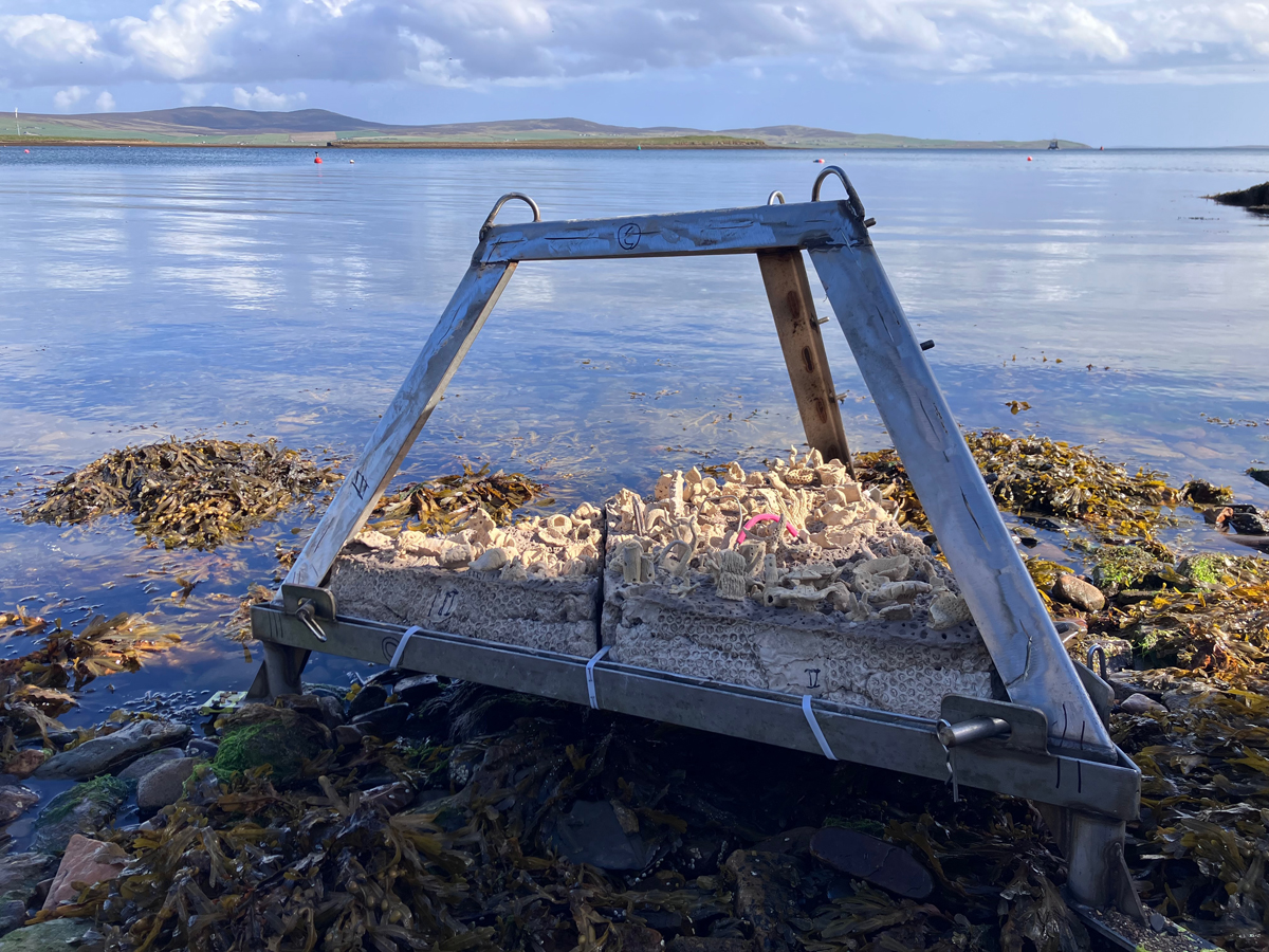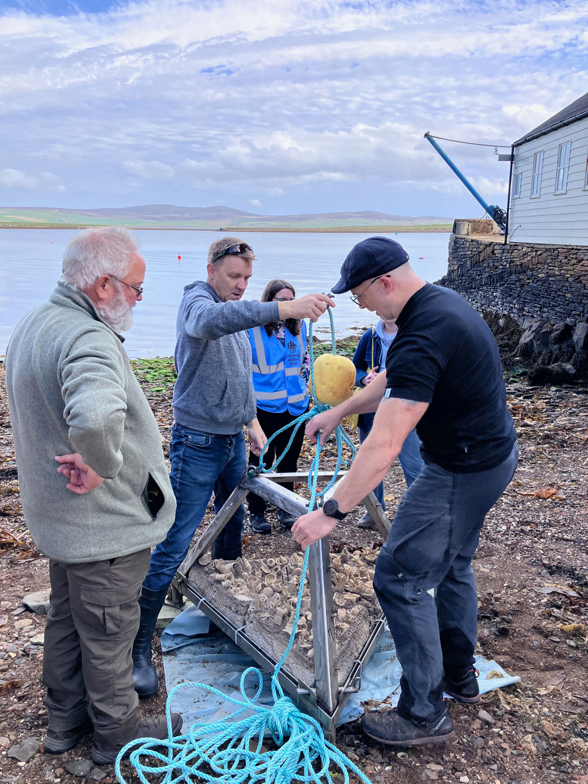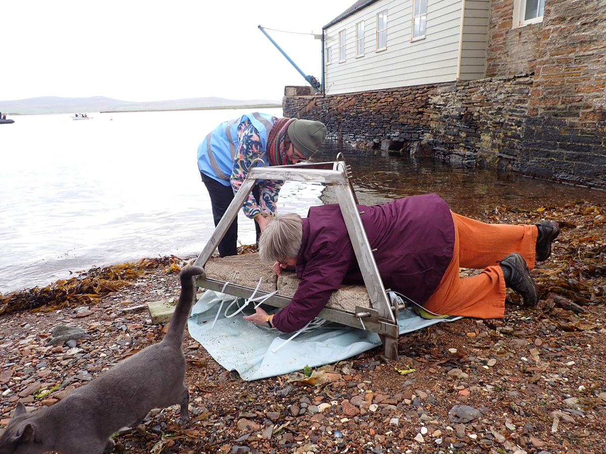 I visited Orkney again to finish constructing the concrete and clay mooring for Shoogly Holm. At a public drop-in event we assembled the mooring parts on the beach at high tide and mortared the small clay sculpted pieces to concrete bases within the EMEC-donated steel frame. This will become the ‘underwater bug hotel’ providing many different shapes and textures for marine life to attach to and settle on. Then by a great communal effort, the mooring was carefully lifted down the beach to the low water mark, ready to be sited the next day by boat.