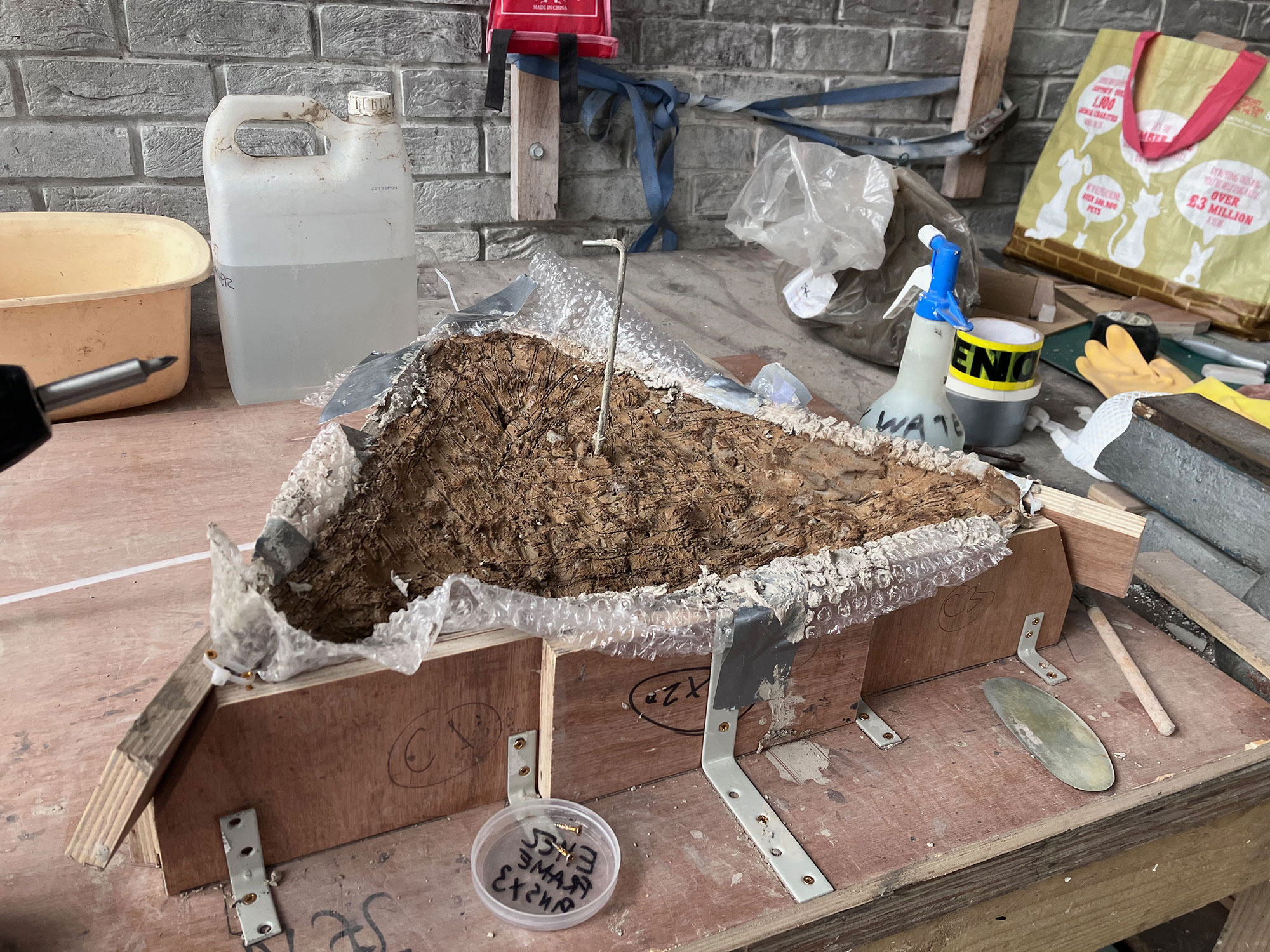 I used a project space at Edinburgh Sculpture Workshop, and worked in their large covered yard to make the shuttering (wooden frame moulds) for the 8 concrete pieces to go into the EMEC metal frames. I liaised with Artecology, who helped me with the mixing and pouring process that they use. I designed the pieces to fit each of the frames and ensured they will be securely attached once in the sea. I had discussions with the Orkney harbour team and local volunteers in Stromness about how best to safely install the mooring coming up with a workable plan, thanks to their knowledge and ingenuity.